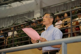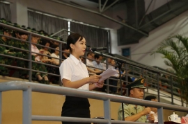 9月10日上午,在松江校区体育馆隆重举行了2016级新生开学典礼暨入营仪式。校党委书记李江,校党委副书记夏斯云,副校长姚秀平、史健勇、鲁嘉华,军训师师长霍华中校,及各相关学院、部处负责人,部分辅导员和班主任(导师)等出席了仪式。仪式由副校长鲁嘉华主持。全体2016级新生身着军装,以饱满的精神和整肃的军姿列队在体育馆内参加了仪式。