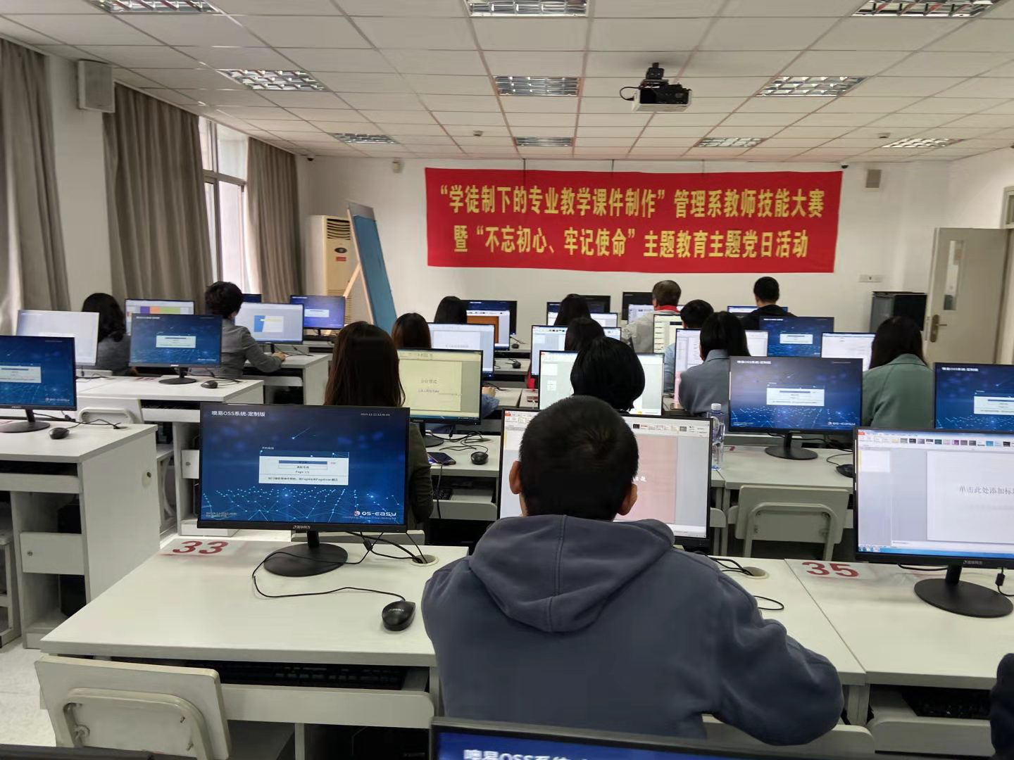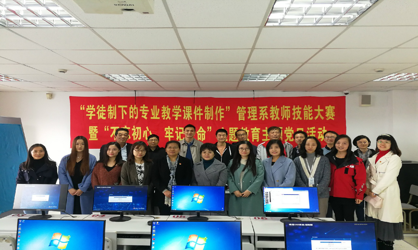 为了扎实推进“不忘初心、牢记使命”主题教育,立足岗位建功,积极发挥党员引领作用, 11月22日下午,管理系党支部在综合楼705机房举办“不忘初心、牢记使命”主题教育主题党日暨“学徒制下的专业教学课件制作”教师技能大赛,共有15名专业任课教师参加,学院党委副书记李云先、副院长朱建军、万军以及工会副主席杨培成莅临比赛现场指导。