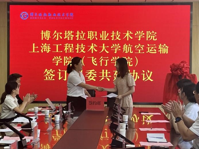 博尔塔拉职业技术学院团委副书记伏丽娟与航空运输学院(飞行学院)团委副书记赵晓艺代表双方签订两方团委共建协议书。双方今后将共享资源,增进交流,共同开展内容丰富、形式多样的组织活动,实现“优势互补、资源共享、取长补短、共同提高”。