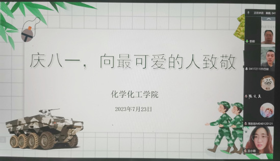 7月23日,在中国人民解放军建军96周年来临前夕,化学化工学院开展以“庆八一,向最可爱的人致敬”为主题的慰问活动,学院党委副书记秦颖,辅导员王新燕、王小萌在线慰问了服役同学常彤彤、陈文昊、吕骏。