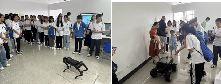 在机器人实验室,胡凌燕教授带领同学们接触了仿生狗、智能小车、机械臂等最新的机器人领域的科技成果,并了解到了这些机器可以对目标进行导航定位、实施跟随等,在消防,巡检,医疗方面具有较强的实用价值。