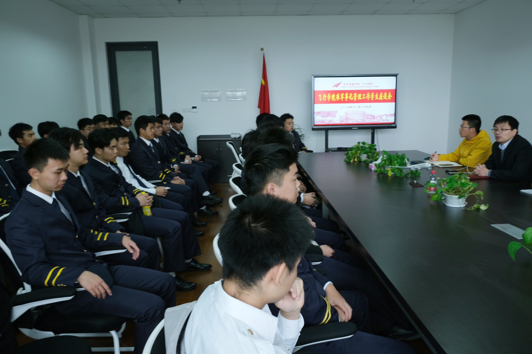 为贯彻落实“不忘初心、牢记使命”主题教育精神,积极落实问题整改,切实做好“三全育人”工作,扎实推进准军事化管理工作,解决学生急、难、愁、盼问题,让飞行专业学生吃得放心、学得专心,11月29日下午,飞行学院组织了飞行技术专业在校三个年级的30多名学生代表在6423会议室召开了飞行食堂就餐问题专题座谈会暨准军事化管理工作学生座谈会,听取学生的意见、建议,院党总支副书记戴振华老师、18级教导员周昌野老师、19级教导员唐致远老师和19级辅导员刘洋老师出席本次会议。会议由周昌野老师主持。