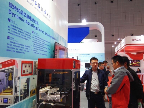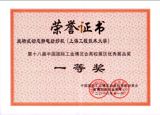 服装学院辛斌杰教授团队参展项目“旋转式动态静电纺纱机”荣获本届工博会高校展区优秀展品奖一等奖,该设备可以制备纳米级纺织材料,具有自动化程度高、控制精度好、纳米级精密加工等优点。