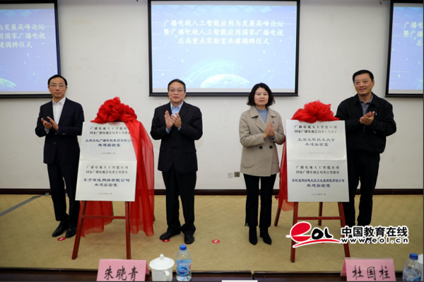 党委副书记、副校长朱晓青、罗毅副局长、杜国柱副院长、刘晓峰副总裁共同为“广播电视人工智能应用国家广播电视总局重点实验室”揭牌。