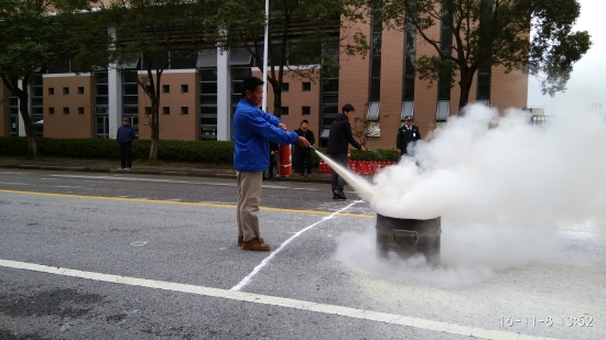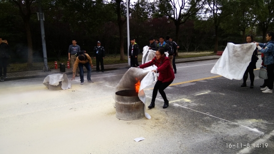 在模拟火情的现场,新进教职工、部分食堂员工及2016级研究生新生约300名手提灭火器材进行了“灭火”实战演练,部分院部的领导也参与其中。在演练中,保卫处反复强调了灭火器操作要领——“一提、二拔、三压、四喷”,并对现场的部分错误动作进行了纠正。2016级研究生还学习并实操了用灭火毯进行灭火的技能。同期,长宁校区、新村路校区等也先后组织师生开展灭火器材操作演练等活动。