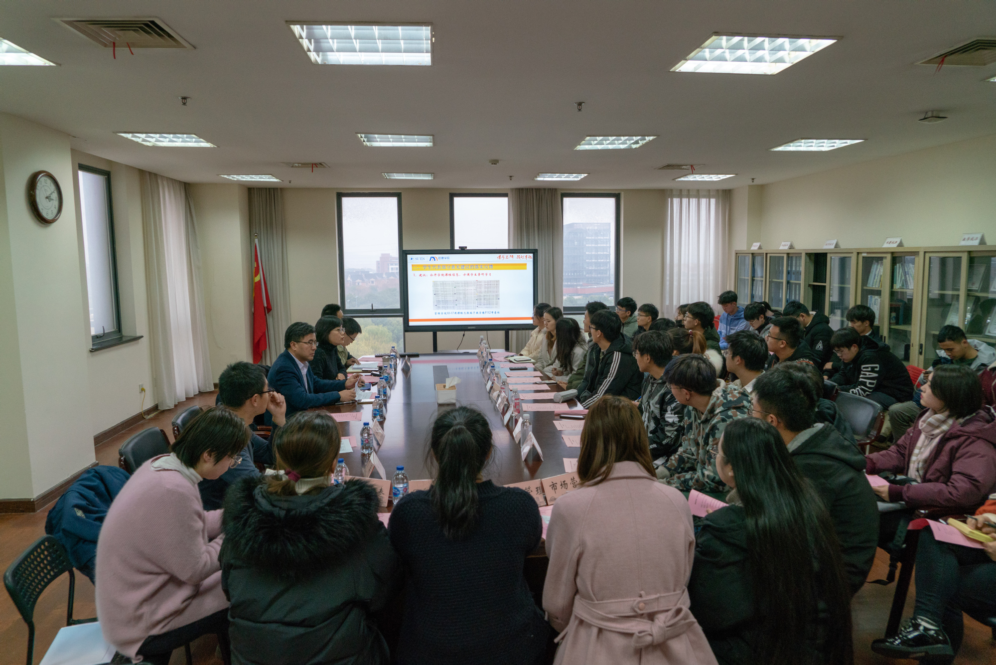 为实现“不忘初心、牢记使命”主题教育常态化的要求,管理学院于12月20日15:00在行政楼612举办了第二期“以学为先、以生为本”院长面对面座谈会。管理学院院长胡斌,院党委副书记程玉莲,副院长李跃文、夏志杰,院学生事务办主任牛兵,本硕各专业学生代表,校第八次团代会代表以及团学干部参加了此次座谈会。座谈会由院党委副书记程玉莲主持。