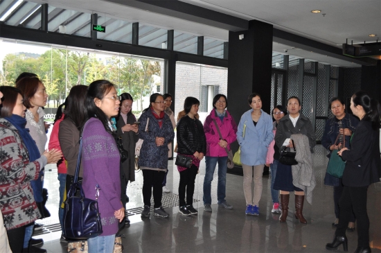 嘉定区图书馆读者服务部的陈巍坚女士热情接待了大家,并介绍了图书馆的基本情况。该馆被美国权威设计杂志《interiordesign》评选为2013年“全球最佳公共图书馆”,其建筑设计沿袭了江南书院风格,屋顶形似打开的书籍,空间的巧妙运用将古朴风韵与现代气质完美融合,馆内家具和灯具全部实现个性化定制。随后,陈女士带领大家参观了各个功能区,包括普通文献借阅区、多媒体文献借阅区、24小时自助图书馆、少年儿童图书馆、视障阅览室、视听室等。嘉定区图书馆运用RFID技术进行图书管理,为不同类型的市民提供差异化的个性服务,注重对弱势群体的关注,此外读者可凭电子票据免费观看剧场的专业演出。