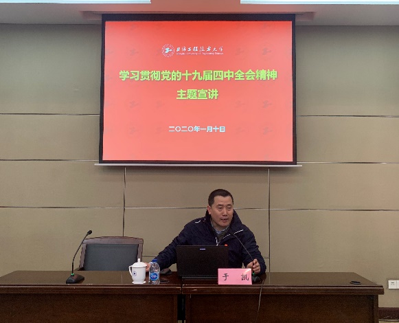 1月10日下午,后勤实业发展中心党总支在图文信息中心第四报告厅举行学习贯彻党的十九届四中全会精神的主题宣讲,邀请上海市委宣传部十九大精神宣讲讲师团成员、“学用新思想奋斗新时代”讲师团成员、上海市习近平新时代中国特色社会主义思想研究中心特聘研究员、马克思主义学院副院长于凯教授作了《开辟“中国之治”的新境界—学习贯彻落实党的十九届四中全会精神》的主题讲座。后发中心全体党员及职工等30余人参与了学习,宣讲由后发中心的党总支书记黄文洁主持。
