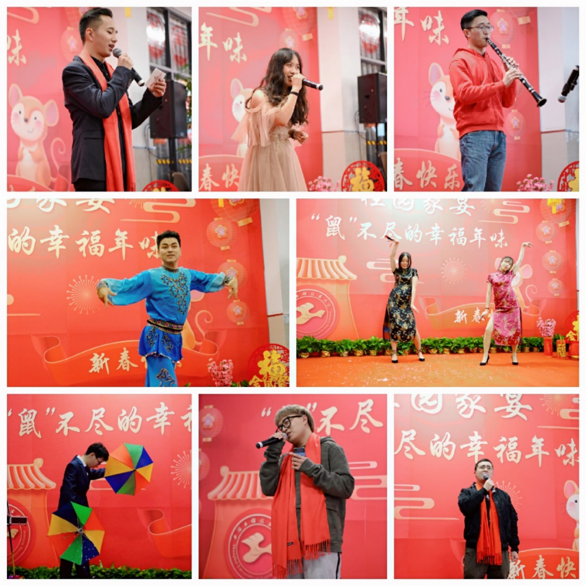 年夜饭现场活动精彩纷呈,既有校团委艺术团学生带来的单簧管演奏、也有各学院学生们的唱歌、舞蹈、魔术、民族舞蹈,向观众们生动展现了校园文化艺术建设过程中所取得的最新成果,将现场气氛推向高潮,全体师生积极互动,共同参与趣味盎然的游戏环节,现场欢声笑语不断。