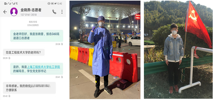 在得知上海市因返沪车辆增多、多个高速路口急需疫情防护志愿者的信息后,党支部书记张晓普第一时间报名了G60高速公路道口的志愿者,学生党员潘晓樊报名了G15朱桥高速公路道口的志愿者,随时准备奔赴抗疫阻击战的前线。