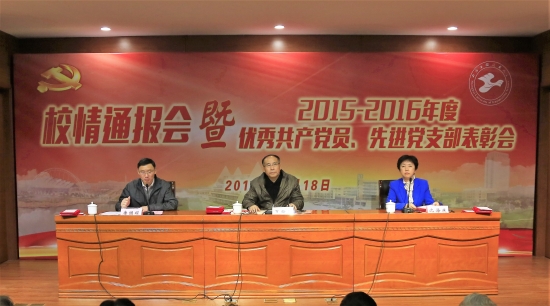 11月18日上午,学校在长宁校区教学楼一楼报告厅召开校情通报会暨退休教工党总支2015-2016年度优秀共产党员、先进党支部表彰会。校党委副书记、校退管会主任、校工会主席夏斯云出席会议,近170名退休党员代表和退休骨干济济一堂参加会议。通报会由退休教工党总支书记沈海庆主持。