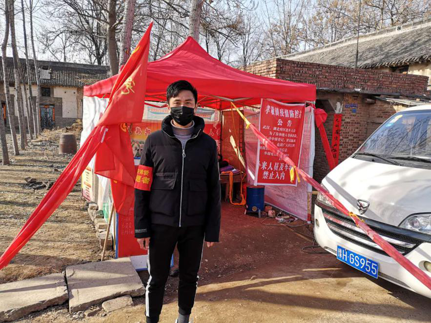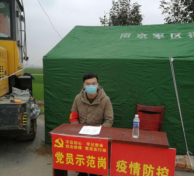 “面对这次突发疫情,作为党员,要树立大局意识,增强责任心,加强宣传,奋斗在防疫的一线。不忘初心、牢记使命,抗击疫情,我们党员在行动!”电院研究生第四党支部党员宋紫阳,响应村委会的号召,主动加入到家乡安徽省蚌埠市固镇县杨庙乡任湖村的疫情防控志愿工作中,每日8:00-18:00之间,在党员示范岗负责道路设卡检查、紧控人员流动,做好相关信息登记,为抗击疫情、保护村民健康贡献自己的力量。!