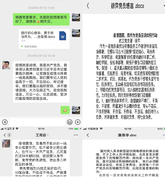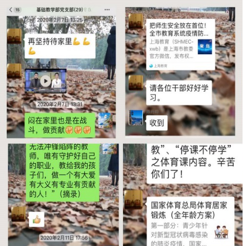 行政、政工党支部分别于2月10日和2月11日通过微信群召开主题为“守望相助,同舟共济,阻击疫情,保卫院校”和 “践行初心使命、勇于担当作为、全力阻击疫情”的主题党日,政工党支部的党员通过集体学习、自学,每位党员发送题为“疫情面前,我作为共产党员应该如何行动”感言等诠释党员在疫情防控面前应承担的责任。行政党支部在沪党员与外地党员积极开展线上任务对接。两个支部党员积极组建的疫情防控志愿者服务队,为开学的志愿服务做好准备工作。