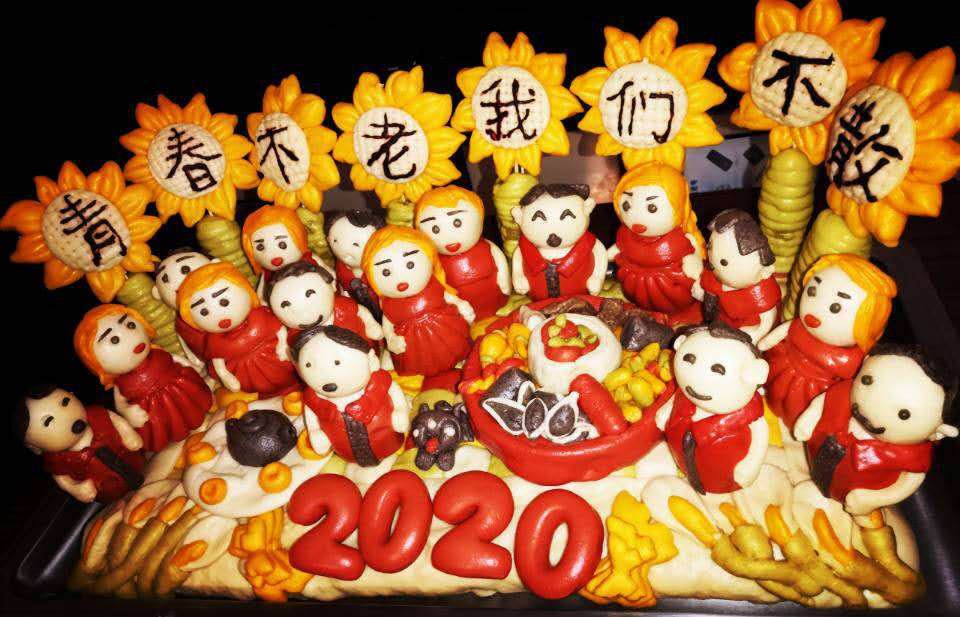 和大部分人一样,我一直呆在家中关注疫情,做好防护,引导亲友不串门、不集会、不聚餐,尽量减少不必要的外出。也利用这段时间,学习了一道特色的家乡特色美食——面塑。食材比较简单,只需将面粉、酵母、蔬菜汁、奶粉、蜂蜜和水,按一定比例调好,然后将醒好的面团捏出不同造型,再用竹签固定到一起,最后蒸30分钟左右就可以出锅了。这份美食寄托了我对家人、朋友、同学的思念,青春不老,我们不散,同时,我也想祝愿奋战在一线的医护人员们,战胜疫情,安全归来。