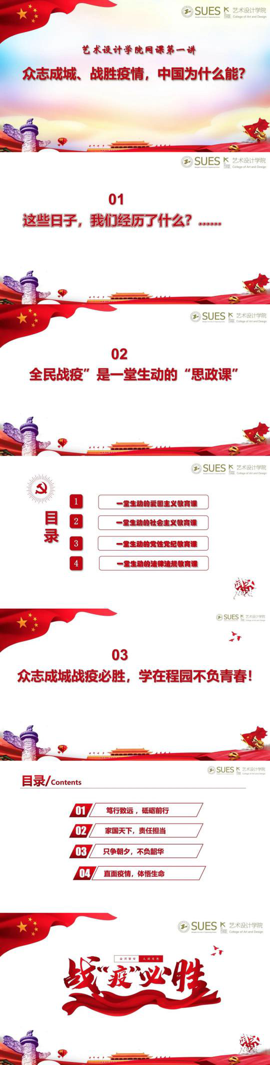 艺术设计学院全体上下积极响应,提高政治站位,充分认识组织本次“思政大课”的重要性,根据学生处安排,于3月8日早上开展视频会议,对工作进行安排布置,加强宣传和组织管理,积极占领网上阵地开展网络思政,并面向全体学生配发“众志成城、战胜疫情,中国为什么能?”的第一讲PPT,带领学生提前感受爱国主义精神,并为3月9日全国思政大课做足铺垫。