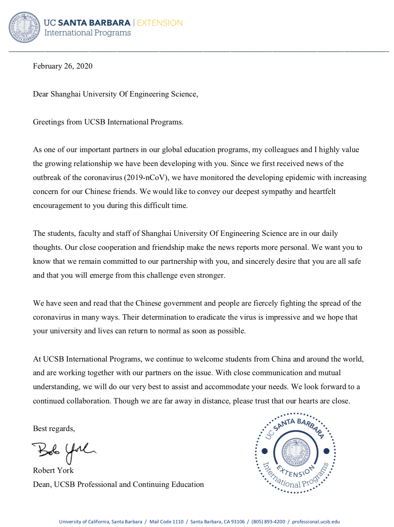 美国加州大学圣巴巴拉分校延展学院Robert York院长通过信函向我校师生表达了衷心的鼓励,他表示非常珍视与我校的合作伙伴关系,一直心系我校师生员工的安全,同时,他也高度赞扬了中国在新冠疫情防控方面所做的努力,表示将一如既往欢迎中国学生赴美留学并尽力提供帮助,虽然相隔千里,但我们共同战“疫”,相信生活很快会回归正常。
