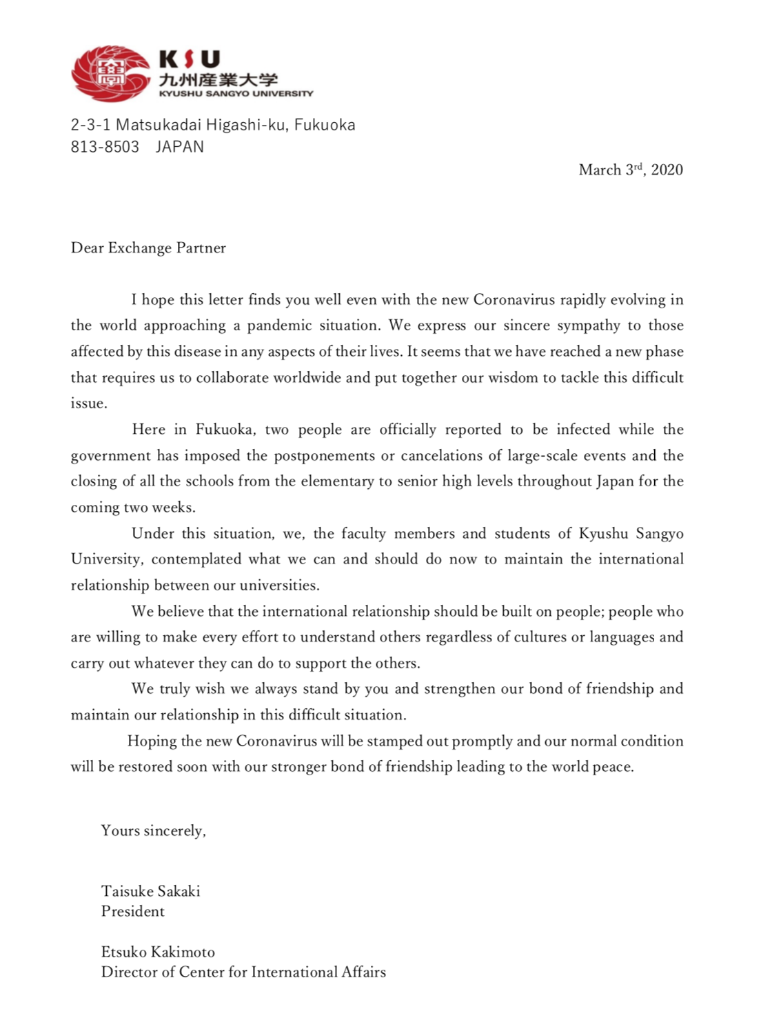中日互为重要的近邻,此次面对困难和挑战,中日守望相助,同舟共济。在疫情席卷全球之时,日本九州产业大学Taisuke Sakaki校长通过来信向我校师生表达了诚挚的问候。他表示,面对这次困难,需要世界合力抗“疫”,共担风雨,在这困难时期,不论文化或语言如何,我们都愿意尽一切努力理解他人,并尽其所能支持他人。他也希望两校能携手共渡难关,再续蓬勃发展。