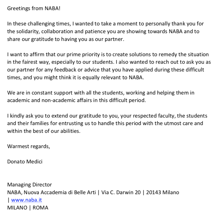近日,意大利米兰新美术学院常务董事Donato Medici教授,通过邮件向我校师生传递了深切的慰问和支持,同时也表达了他们的真诚谢意。他表示,会针对疫情在意大利的发展,制定切实有效的解决方案,保证学生在疫情期间的学业,为他们提供帮助。在共同抗“疫”的斗争中,我校与意大利米兰新美术学院的友谊进一步升华。