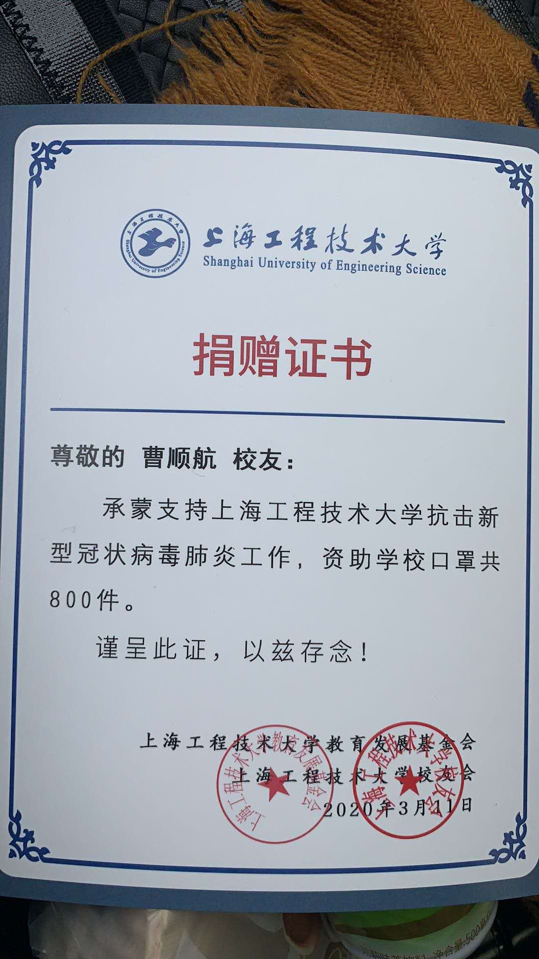 疫情发生后,口罩等医疗物资非常紧缺。作为校友理事会成员的曹顺航校友心系母校,主动联系学院询问相关情况,当他了解到学校亟需口罩等物资用于防控,毫不犹豫地承诺设法采购口罩等物资捐赠母校,几经周折和等待后终于成功采购到一批口罩并及时送到母校。 曹顺航表示“母校的培育之恩永生难忘,今天能为母校的疫情防控贡献自己的微薄力量我很开心,祝愿母校疫情防控工作一切顺利,希望母校的明天越来越好。”