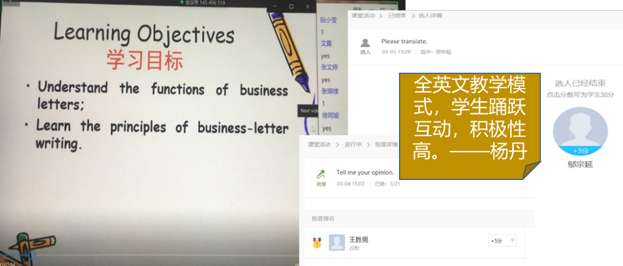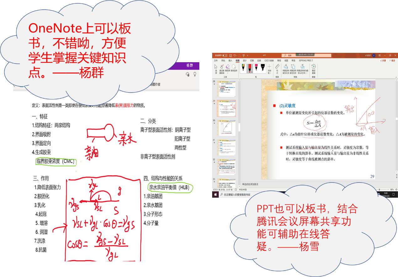 各位老师选择“学习通+腾讯会议+EV录屏”“学习通+微助教+腾讯会议”“学习通+对分易+微信群”等多平台复合教学模式。学习通作为主战场供学生签到、提问、测试、自学;腾讯会议、腾讯课堂、对分易等平台直播,用来解析重点、难点,掌控和了解学生在线学习情况;EV录屏软件可对上课材料进行保留,微信群、QQ群等方式联系学生,确保了每一位学生进课堂、不掉队,建立有温度、有质量的云端课堂。
