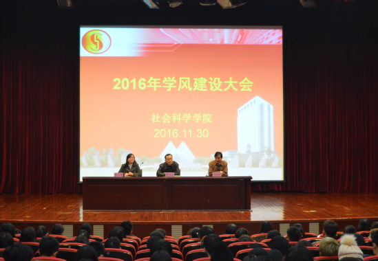 良好的学风是一所大学的灵魂,是学校生存与发展的重要支柱。为了使全体同学高度重视我校即将迎来的本科教学审核性评估,以更好的风貌来扎实推进学风建设,在继学院召开全体教师大会之后,11月30日晚,社会科学学院在志宏堂召开了全院学生参与的“2016年学风建设大会”。学院党总支书记曹开云老师、张健明教授、党总支副书记程玉莲老师、全体辅导员及学院大一至大四的全体同学,以积极的姿态参与了本次大会,志宏堂全场座无虚席。大会由程玉莲副书记主持。