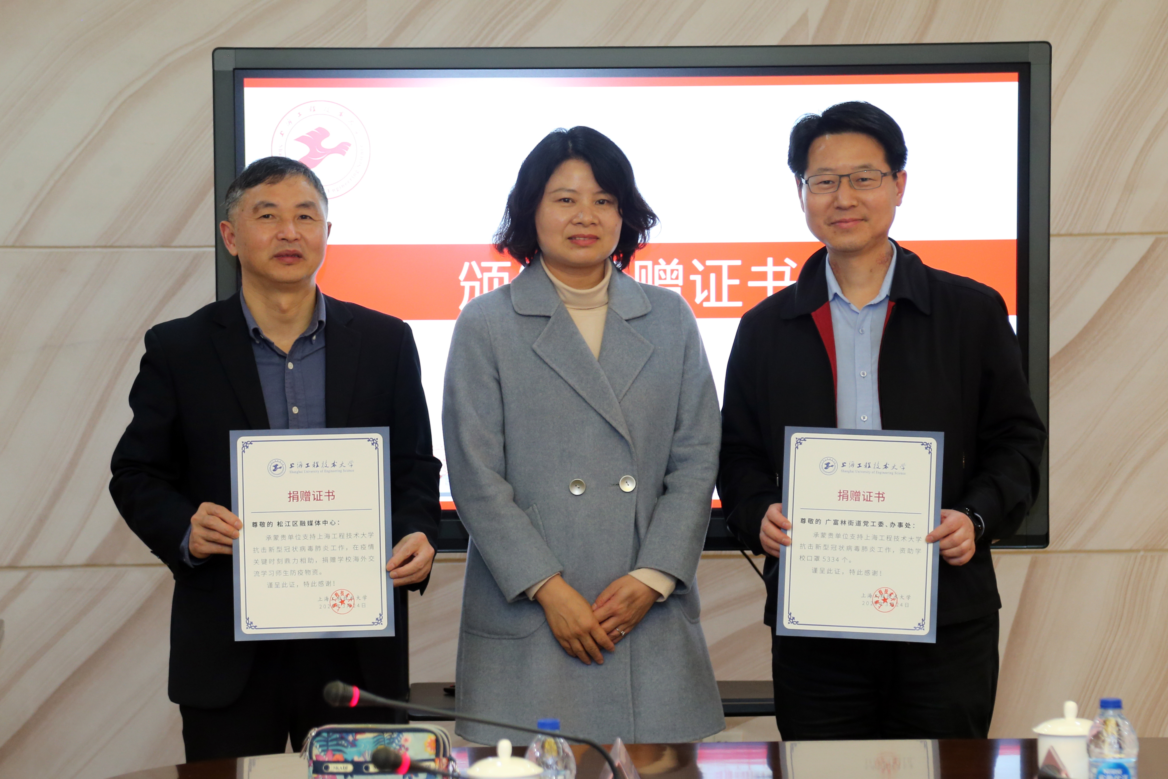 党委副书记、副校长朱晓青代表学校向捐赠单位致以诚挚感谢并颁发了捐赠证书。朱晓青副书记指出,一直以来,我校与松江区和广富林街道的合作都是非常广泛而深入的,G60科创走廊建设、区域党建联盟、科普服务进社区、“春风行动”地校联合招聘等项目都为我校人才培养工作提供了良好的平台。此次,更是在短短几天内,就从本已稀缺的防疫物资中匀出相当数量的医用口罩支援我们的海外师生。这无疑不体现了双方的深情厚谊和守望相助,更进一步构建了“区校防疫共同体”。国内疫情发生后,区融媒体中心第一时间对我校疫情防控工作进行了深入细致的宣传报道,先后刊发了《大爱之心,上海工程技术大学90后教师捐出25万元蜜月旅行费》《30小时绘制,工程大学子为“硬核教授”张文宏主编的防疫书配上插画》等报道,多次采写宣传了我校学生志愿者的抗疫先进事迹,为凝聚我校师生共同抗疫力量作出了积极的贡献。一周前,当区融媒体中心得知我校海外师生防疫物资紧缺的消息后,积极帮助联系区经委、民政局、红十字会以及口罩生产企业,协助筹措口罩等防控物资,充分体现了作为媒体的强烈社会担当和责任感,令我们倍感温暖、深受感动。朱晓青副书记强调,这不仅是一次物资的捐助,更是一部区校联动的爱国主义教育实践教材,一堂感人至深的爱国主义教育实践大课。