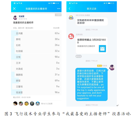 飞行技术系在2018级飞行技术专业学生中就前三周教学情况做了我最喜欢的主播老师投票活动,合计167位同学积极参与,飞行技术团队顾莹、杜丽娟、吕鸿雁、党淑雯老师位列前列,成为疫情防控特殊时期下的践行使命教学先锋,团队在前期线上教学的教学实践成效从学生对老师及课程的喜爱程度可见一斑。