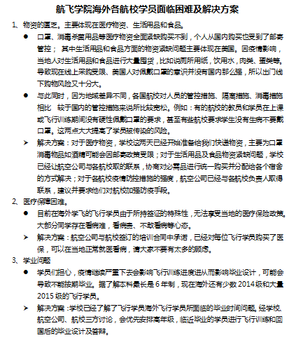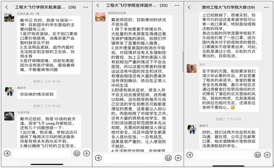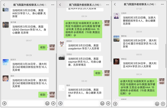为更好了解海外学子在国外航校的学习生活情况,尽可能帮助他们解决当前遇到的困难和诉求,学院还特地开设多个国外航校沟通微信群,学生们可随时在群内反馈思想动态及诉求。学院根据学生的反馈,及时形成学院海外各航校学员切实困难报告,召开专题研讨,制定解决方案。