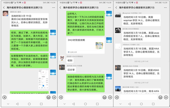 同时,学院积极做好海外学子心理辅导工作,提供线上心理援助。普及预防知识,做好思想工作,解决相关疑惑、打消海外学子顾虑,确保学生思想情绪稳定,不恐慌,不悲观,不信谣,不传谣。掌握学生思想动态,要求学生遵守执行所在国的疫情防控对策,发现异常情况及时汇报,注意自身安全,与国外航校老师、国内航飞学院老师保持密切联系,保护好自己,学院是每一位海外学子最坚强的后盾!