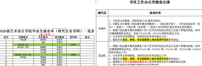 艺术设计学院高度重视学生就业工作,及时召开专题党委会,研究制定“将就业目标任务纳入系主任年度考评体系”制度,建立“毕业设计导师同时也是就业导师”的双导师制;一把手定期听取和研究就业工作,抓系主任就业责任,每两周发布一次学院各系、各导师、各辅导员的就业率排行,注重全院发动、全员协助就业的主旋律并已经形成。