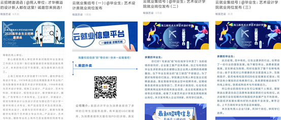 针对就业上游用人企业,广泛拓展就业市场和渠道。发布微信云招聘邀请函,通过各班子成员、系主任、毕设导师、辅导员广泛邀约用人单位云招聘选才,主动电话联系校友和长期合作企业收集用人信息,挖掘智联招聘、BOSS直聘、51JOB等社会知名招聘网站等招聘信息,发布艺术设计类云就业信息微信推送三期(后期还有三期),累计挖掘岗位信息600余个。