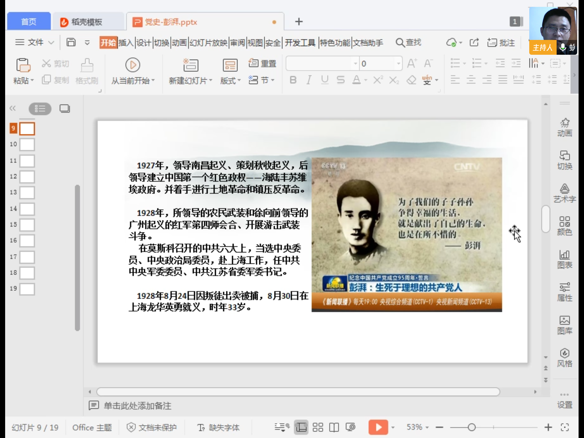 了解党和国家历史上的重要人物是学党史的重要内容之一,张老师选取了被毛泽东主席称为“农民运动大王”的中国共产党早期农民运动领导人彭湃作为解读对象。从生活优越的大地主家公子到坚定的共产主义战士、从创办社会主义研究社到建立了海陆丰苏维埃政权、从组建“六人农会”到开办农民运动讲习所、从参与领导南昌起义到策划秋收起义,课堂上彭湃短暂却不平凡的一生吸引了同学们的兴趣,也引起了同学们对信仰的深度思考。学生党员潘晓樊谈到感想时说“是对共产主义的强烈信仰促使彭湃做出了一番轰轰烈烈的革命事业,我们青年大学生党员要继承彭湃先烈大无畏的革命斗争精神,积极投身于建设中国特色社会主义的事业之中。”入党积极分子庞庆龄在学习感悟中提到“彭湃前辈焚烧田契毁家纾正是他坚定理想信念使然表现,他为理想无私奉献、慷慨就义的行为为我们当代青年学生树立了榜样,也树立了精神的丰碑,我们应以功成不必在我的精神境界和功成必定有我的历史担当,承担起历史使命和时代重任。”