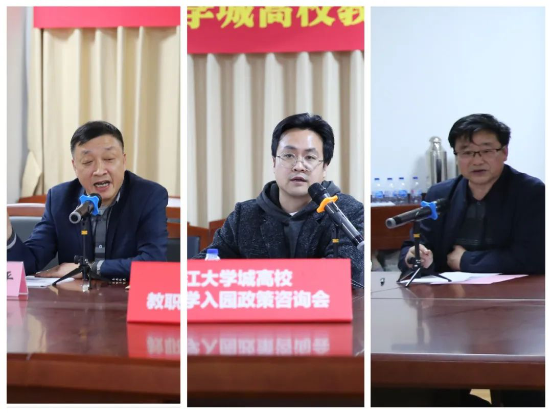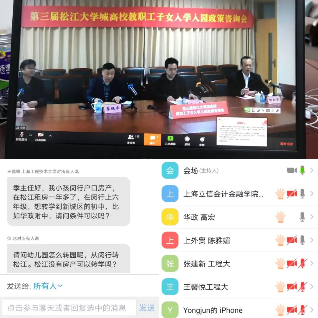 松江大学城服务中心季培金老师代表区政府、大学城服务中心感谢各高校对此次活动的支持,并对近年来大学城高校教职工子女统筹入学入园工作进行了简要介绍,在教育资源紧张的情况下,希望通过搭建平台,更有针对性地解决好大学城高校教职工子女入学入园工作。之后,松江区教育考试中心招生办季银平主任从入学、转学、中考三方面详细介绍了松江区的最新政策。松江区教育局学前教育科马鑫老师从公办园招生概况、招生日程安排、报名平台信息登记等多方面进行了政策解读。在互动环节,来自我校和其他高校的老师通过视频连线进行了咨询,松江区教育考试中心、学前教育科老师对与会老师提出的问题一一解答。不少老师会后表示,会议很实用,为老师们解决最实际最迫切的问题提供了帮助。