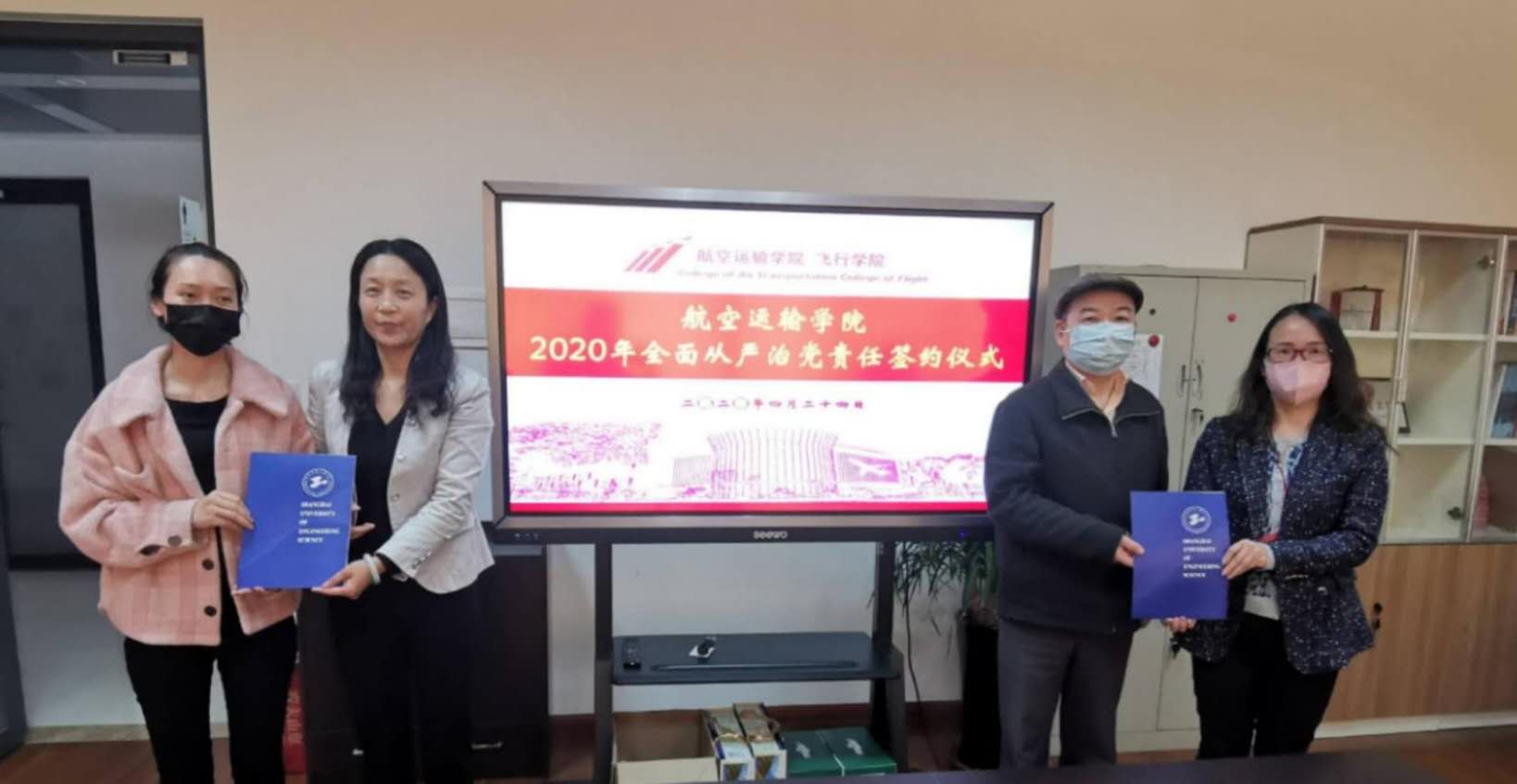在签约仪式上,党委虞蓉书记与党委副书记、院长何法江分别与学院副书记、副院长、工会主席、党支部书记、系(室)主任等签署了《航空运输学院2020年全面从严治党责任书》,并传达了学校2020年全面从严治党工作会议精神。航空运输学院党委将坚持以习近平新时代中国特色社会主义思想为指导,深入学习贯彻党的十九大和十九届二中、三中、四中全会精神,全面落实十九届中央纪委四次全会精神、十一届上海市纪委四次全会精神,贯彻落实市委、市教卫工作党委的各项决策部署,压紧压实管党治党责任,按照学校全面从严治党向基层有效延伸以及党内监督的有关规定,切实做好航空运输学院党委2020年全面从严治党工作。
