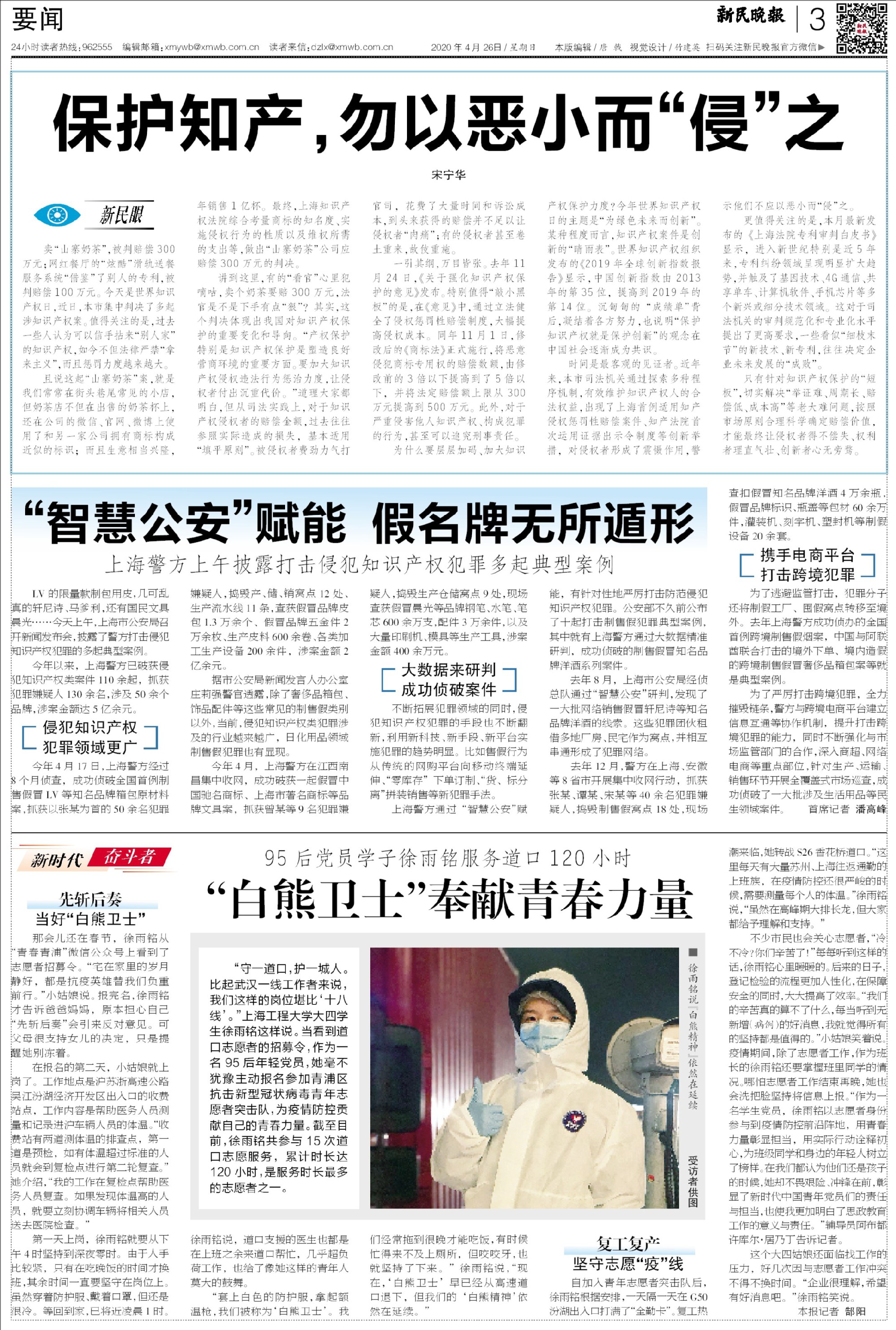 “守一道口,护一城人。比起武汉一线工作者来说,我们这样的岗位堪比‘十八线’。”上海工程大学大四学生徐雨铭这样说。当看到道口志愿者的招募令,作为一名95后年轻党员,她毫不犹豫主动报名参加青浦区抗击新型冠状病毒青年志愿者突击队,为疫情防控贡献自己的青春力量。截至目前,徐雨铭共参与15次道口志愿服务,累计时长达120小时,是服务时长最多的志愿者之一。