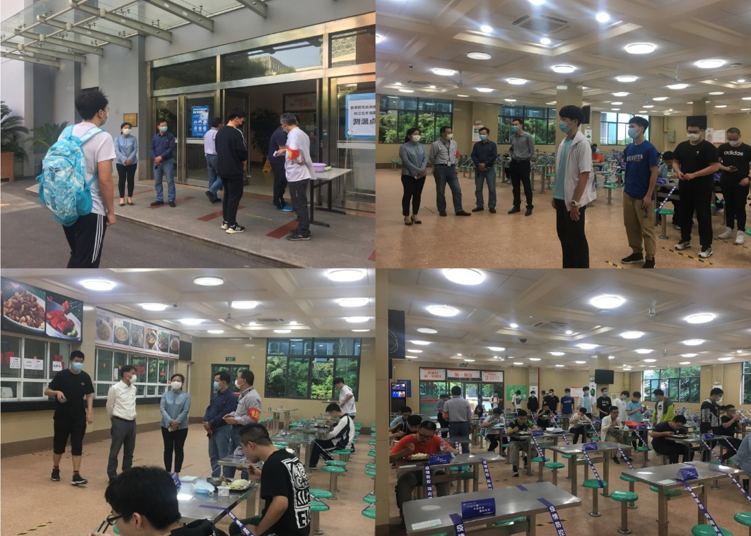 晚餐时间,党委副书记李云先,副院、校长郑卫、万军一行走进学生食堂,了解食堂的消毒清洁工作、菜品供应情况。要求学生按照地标线排好队买餐,严格执行“一人一桌,同向就餐”原则。