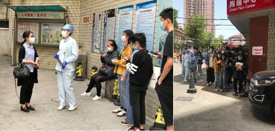 5月13日中午,预约参加核酸检测的45名专升本考生在学院的统一组织下,分两批到达上海市第一人民医院分院进行核酸检测。