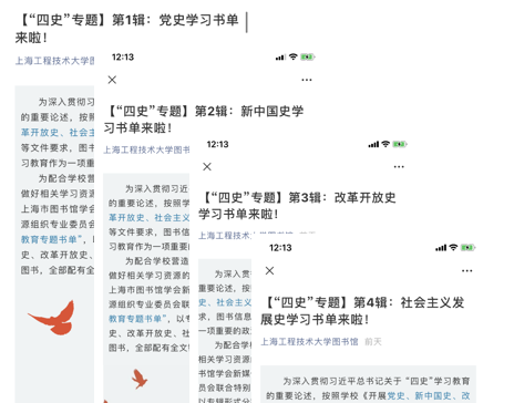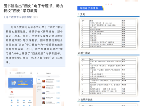 会上,李军书记首先介绍了近期图信档联合党总支的“四史”学习教育情况,党总支把“四史”学习教育作为一项重要政治任务来落实:联合超星在“学习通”APP上开辟了“四史”电子专题书;推出上海市图书馆学会新媒体阅读推广委员会、信息资源组织专业委员会联合特别策划的一史一辑“四史”学习教育专题书单;正在筹划设立的“四史”学习教育专题展示书架;档案馆推出学校教育帮扶档案展,以图片的形式展示我校对口帮扶的历史,让师生在我校帮扶的历史中感受工程大人的家国情怀。