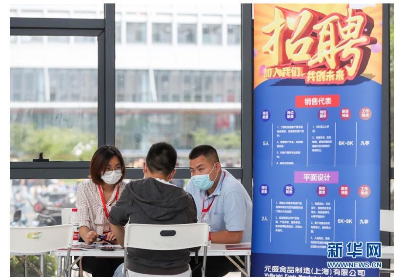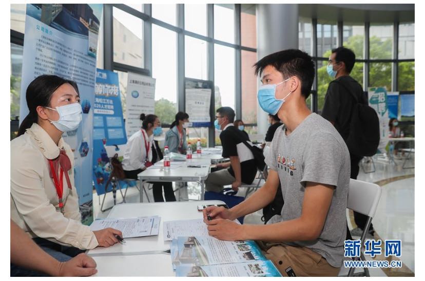 6月22日,求职者(中)在招聘会上应聘。 当日,“2020年区校联合G60科创走廊专场招聘会”在上海工程技术大学举行,50家企业提供近400个工作岗位。 新华社记者 丁汀 摄