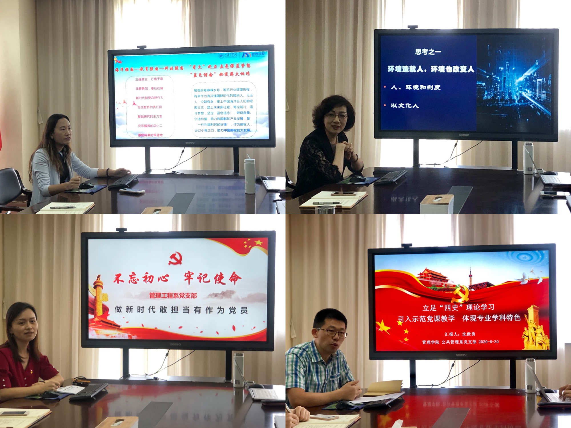 会上,四位教师围绕学“四史”促进学院发展为主题进行交流发言,邮轮人支部委员闫国东老师以“向海图强弘扬‘蓝色信念’”为题,谈海洋强国建设、经济发展、合作交流等,以小我之力,助力中国邮轮的大发展,抒发不忘初心、砥砺前行的家国情怀。邮轮人党支部党员邱羚老师以“思考、分享、交流”为题,运用管理学的原理与案例分析,提倡以文化人,知行合一、进一步激发教师工作的主动性和积极性。信管系党支部书记李旭芳以“做新时代敢担当有作为的党员”为题,介绍了我院刘升教授的事例,让大家学习身边榜样典范,新时代有新担当、新作为。公共管理系党支部书记沈世勇老师立足“四史”理论学习,引入示范党课教学,体现专业学科特色,守正创新,讲好中国治理故事。