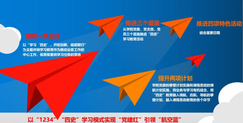 航空运输学院党委将按照总书记的嘱托认真学习马克思主义理论,结合学习党史、新中国史、改革开放史、社会主义发展史,在学思践悟中坚定理想信念,在奋发有为中践行初心使命;在“四史”学习教育中,通过以“围绕一条主线,提升两项计划,推进三个层面,做好四次活动”的“1234”学习模式,用“党建红”引领“航空蓝”,为实现“两个一百年”奋斗目标、实现中华民族伟大复兴的中国梦而努力奋斗。