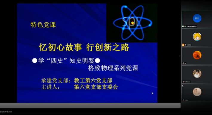 本次党课是教工第六支部特色党课之一,以“忆初心故事、行创新之路——学‘四史’、知史明鉴、格致物理”为主题,支委王顺治老师围绕钱学森曲折艰难的报国之路,以大量具体史料,介绍了钱学森永攀高峰的创新精神、追求真理的求实精神、团结协作的协同精神、胸怀祖国服务人民的爱国精神。引导老师把自己的科研工作与祖国的发展和学校的发展紧密结合起来,勇挑重点,勇攀高峰,不断前行。