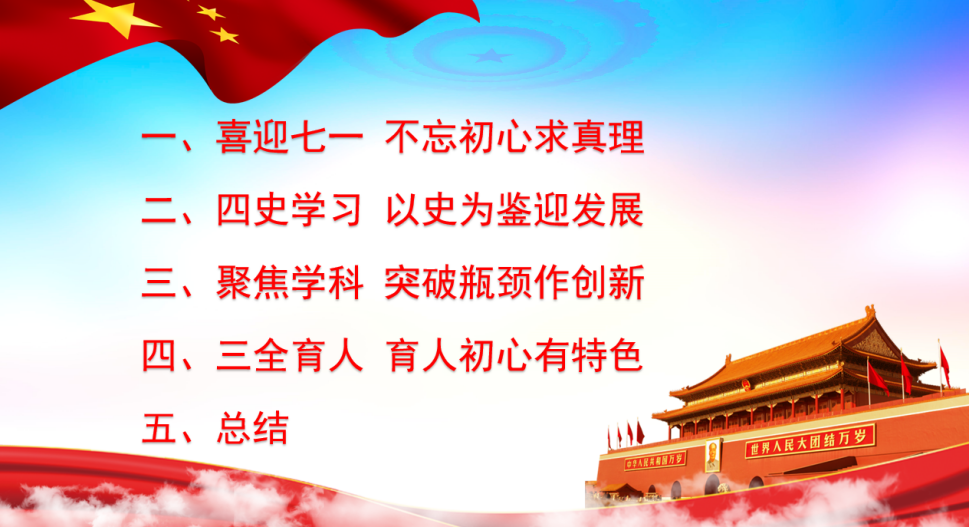 本次活动恰逢七一党的生日,活动主题从中国现代史“真理的味道是甜的”主题报告开始,围绕 “喜迎七一,不忘初心求真理”“‘四史’学习,以史为鉴迎发展”“聚焦学科,突破瓶颈做创新”、“三全育人,育人初心有特色”开展学习