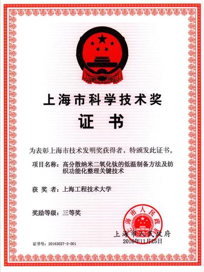 服装学院王黎明教授主持完成的“高分散纳米二氧化钛的低温制备方法及纺织功能化整理关键技术”项目开发的纳米功能纺织品,经专家技术鉴定和科技查新,属于国内首创,具有新颖性和实用性,达到了国际先进水平。项目核心技术已获国家发明专利授权6项,发表高水平论文30余篇,SCI、EI收录近10篇,培养硕士生8名,并获得了上海市优秀发明选拔赛金奖2项,2012年香港桑麻纺织科技奖1项等。项目成果已在多家企业中进行了一定的推广应用,开发了高性能纳米光触媒复合多功能系列的窗帘、家用床上用品及轿车成型地毯、车用脚垫等。