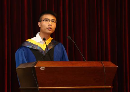 校研究生会主席、上海市年度人物、全国学联第二十六次代表大会特邀嘉宾、机械工程学院马彭涛同学以《青春无悔感恩母校》为题代表全体毕业研究生发言,回忆了在母校学习、生活和成长的点滴,讲述了自己的奋斗历程和取得的成绩,他对母校的悉心培育、老师们的谆谆教诲、亲人的默默支持表示由衷的感谢,并表示在今后的人生道路上勇敢地飞向心中的梦想,为母校增光添彩。