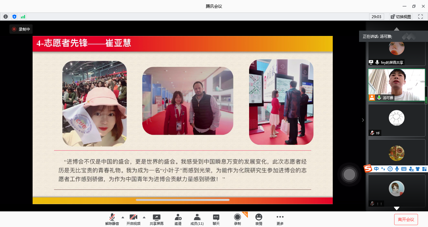 崔亚慧同学作为第二届进博会志愿者代表身份参与了本次学习,她从参加志愿者的初衷和最后的感想两个方面介绍了自己在志愿服务活动中的所感所获。她说,在2008年北京奥运会时期第一次接触到“志愿者”这个新鲜的代名词,从此这三个字深深烙在她的心里。在第二届进口博览会召开之际,毫不犹豫就报名参加志愿服务活动,让她收获最大的是看到了祖国开放包容,互利共赢的大格局,做为青年学子能为这一盛会贡献一份力量感到非常光荣和自豪。
