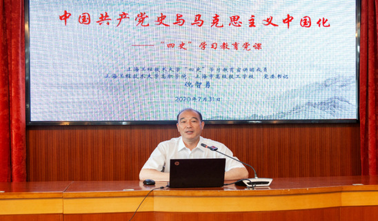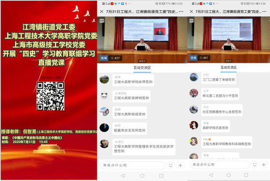 为彰显区域化党建优势,深入推进“四史”学习教育,促进学院、校“四史”学习教育向社会辐射延展,7月31日,高职学院、高级技校创新“四史”学习教育形式,携手江湾镇街道,区、校联动,首次将“四史”学习教育专题党课在现场授课的基础上同步到云端,采用现场授课+“云党课”“云直播”的方式,进行线上线下同频联动学习。本次题为“中国共产党史与马克思主义中国化”的党课由上海工程技术大学“四史”学习教育宣讲团成员、学院、校党委书记倪智勇主讲。除参与现场学习的党员外,来自江湾镇街道所辖各党支部及高职学院、高级技校各党支部党员约1100多人在线聆听了直播“云党课”。