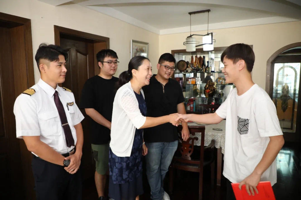 8月11日上午,家住上海市杨浦区的邵逸杰同学收到了来自上海工程技术大学的第一份录取通知书。上海工程技术大学航空运输学院·飞行学院党委书记虞蓉,工程大航飞学院2013届校友、上海航空有限公司责任机长高越,工程大2018届艺术设计学院校友、工程大2020年录取通知书设计者薄海超一同来到邵逸杰同学家中,给他送上了录取通知书——“梦在工程大”。收到这份承载着工程大厚重心意的录取通知书,邵逸杰同学表示:“内心十分荣幸和喜悦,也非常感谢工程大对我的认可”。