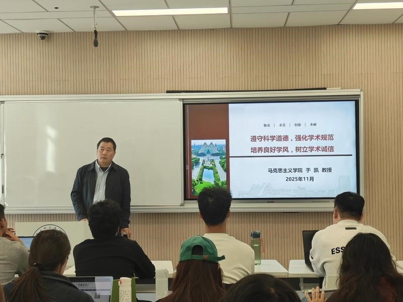 为强化学术规范和加强科研诚信建设,引导学生恪守科学道德、坚守诚信底线,11月5日,马克思主义学院在教学楼C407召开主题为“遵守科学道德,强化学术规范 培养良好学风,树立学术诚信”的学术讲座。会议由马克思主义学院副院长于凯教授主讲,学院2025级全体学生参加会议。于凯老师首先强调了开展学术诚信的重要性,结合马克思主义理论学科的特点与要求,深入阐述了科学道德与学术规范的要求及其对于学术研究、个人成长和学科发展的重要意义。于老师系统梳理了学术研究中可能存在的不端行为及其危害,详细解读了国家和学校在学术规范、科研诚信方面的相关规章制度与政策要求。于老师还通过剖析学术界的典型案例,生动形象的说明了遵守学术规范、杜绝学术不端行为的具体要求,并就如何正确引用文献、通过正确渠道投稿、严谨发表成果等方面提供了具体指导。他强调,要将学术道德内化于心、外化于行,共同营造风清气正、求真务实的优良学术环境。讲座结束后,同学们纷纷表示,通过此次讲座,对学术道德规范有了更深刻、更全面的认识,增强了维护学术尊严、抵制学术不端的自觉性,未来将在科研与学习中严格自律,树立学术诚信。